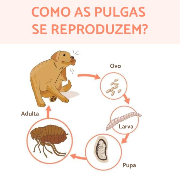 As pulgas são pequenos insetos sem asas, de coloração escura, que se alimentam do sangue do animal. Elas se reproduzem rapidamente e podem causar grandes infestações em pouco tempo.