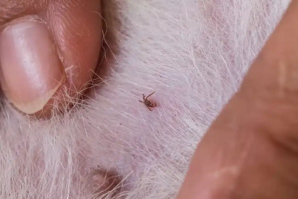 Carrapatos são facilmente encontrados em áreas como orelhas, pescoço, entre os dedos e axilas.