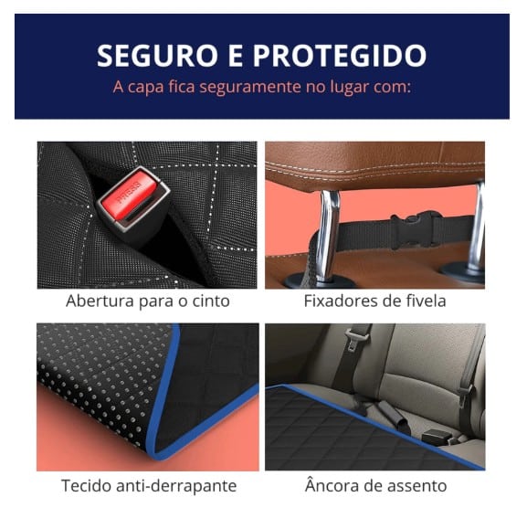 – Segurança: Nosso produto contém âncora de assento e um material antiderrapante no seu verso para evitar que a capa se movimente durante o deslocamento do veículo, além disso tem aberturas exclusivas em velcro para fixar os cintos dos seus pets e de outros passageiros que estejam no banco traseiro.